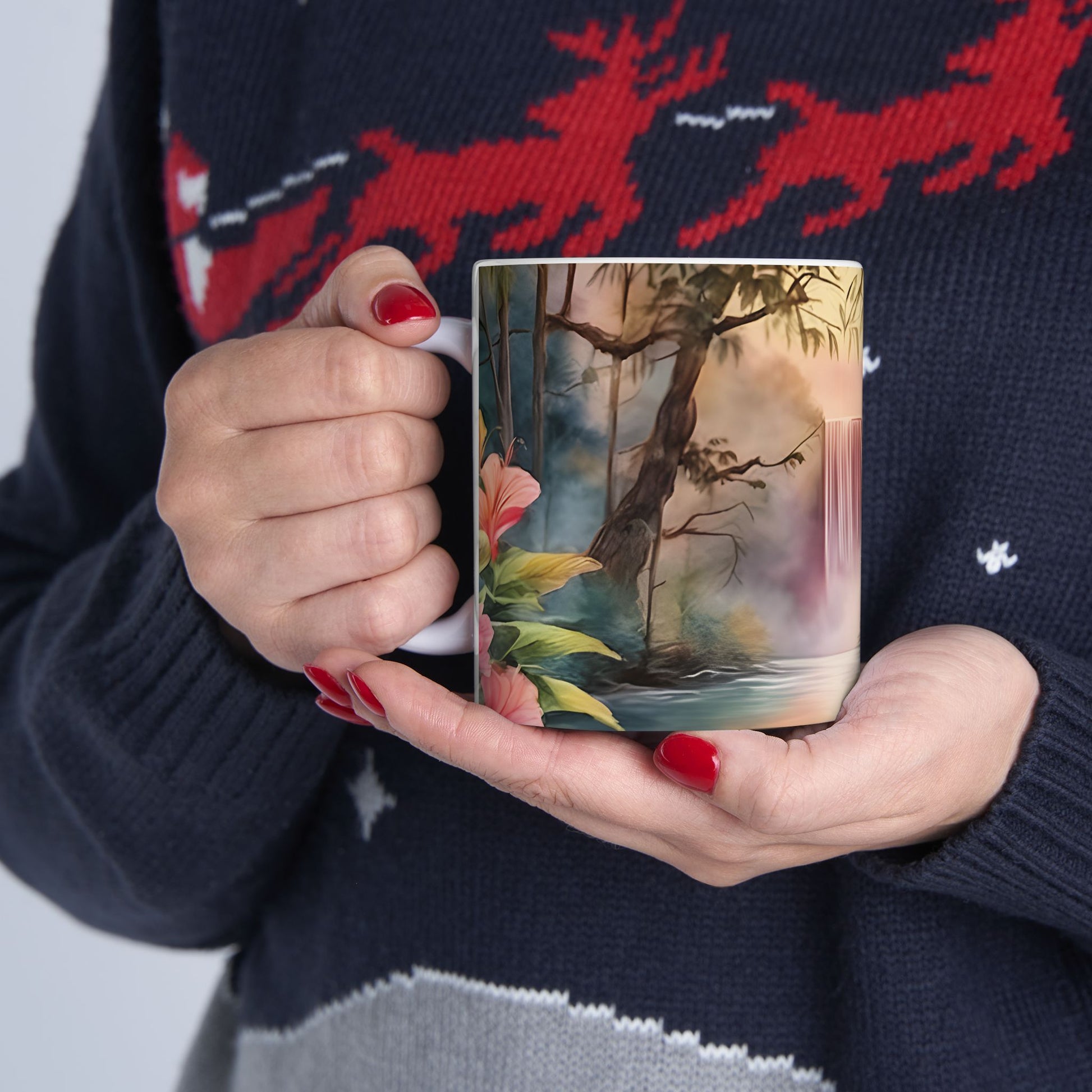 A beautiful hummingbird design with waterfall adorns this ceramic coffee mug, adding a touch of elegance to your morning routine. The vibrant colors and glossy finish make it a perfect choice for bird lovers and those who appreciate intricate designs. Ideal for enjoying a hot beverage while relaxing or starting your day off right. Perfect gift for nature enthusiasts, birthdays, holidays, and special occasions.
