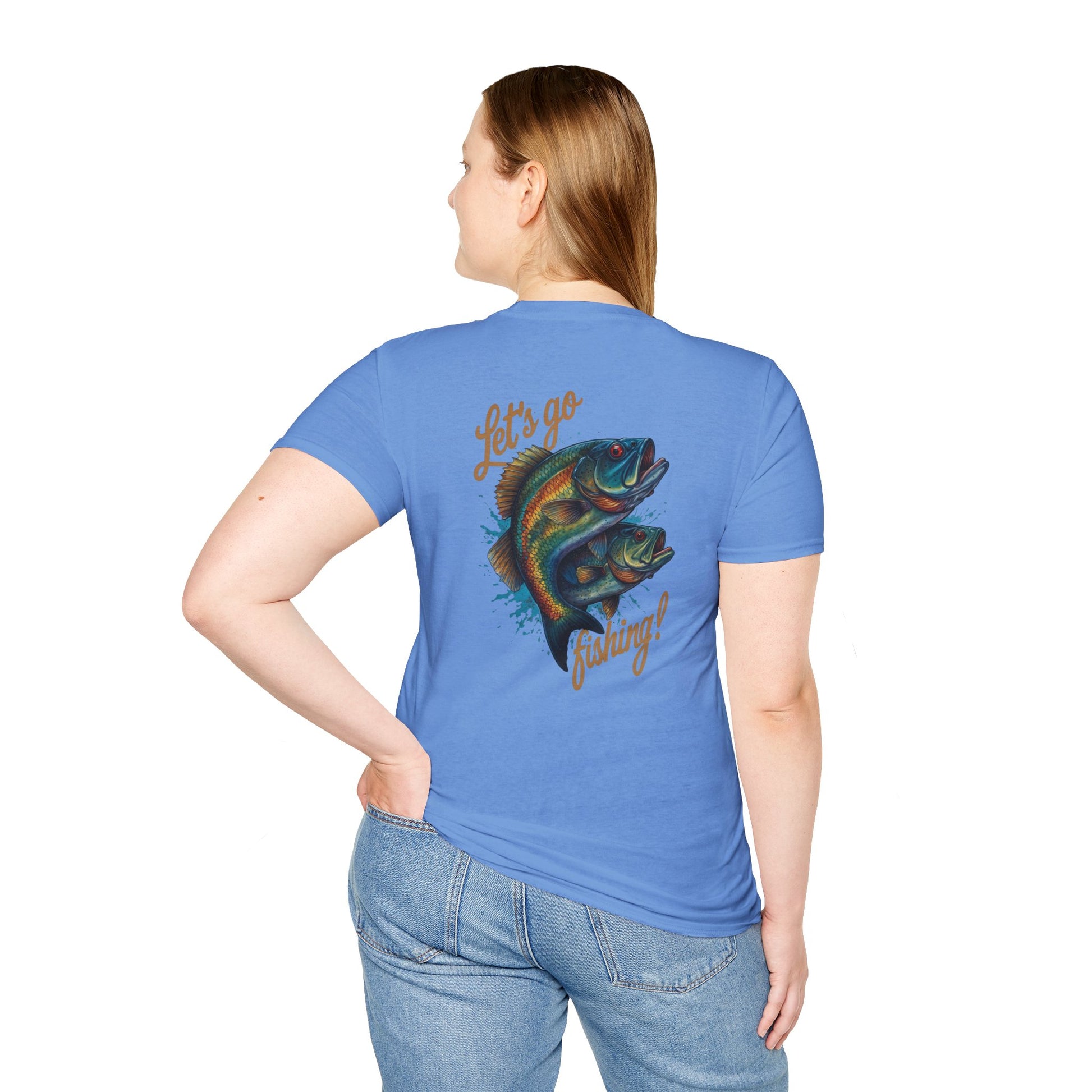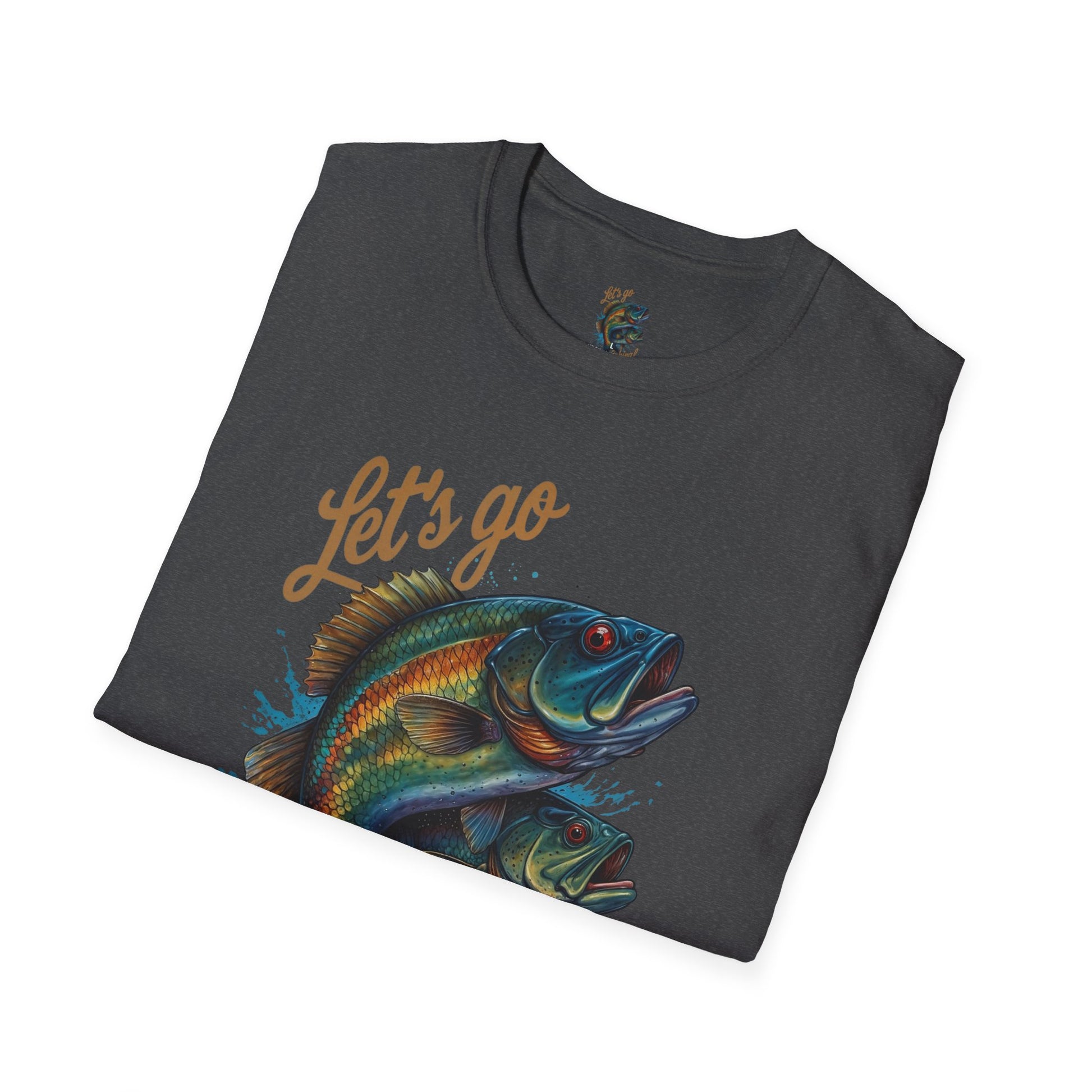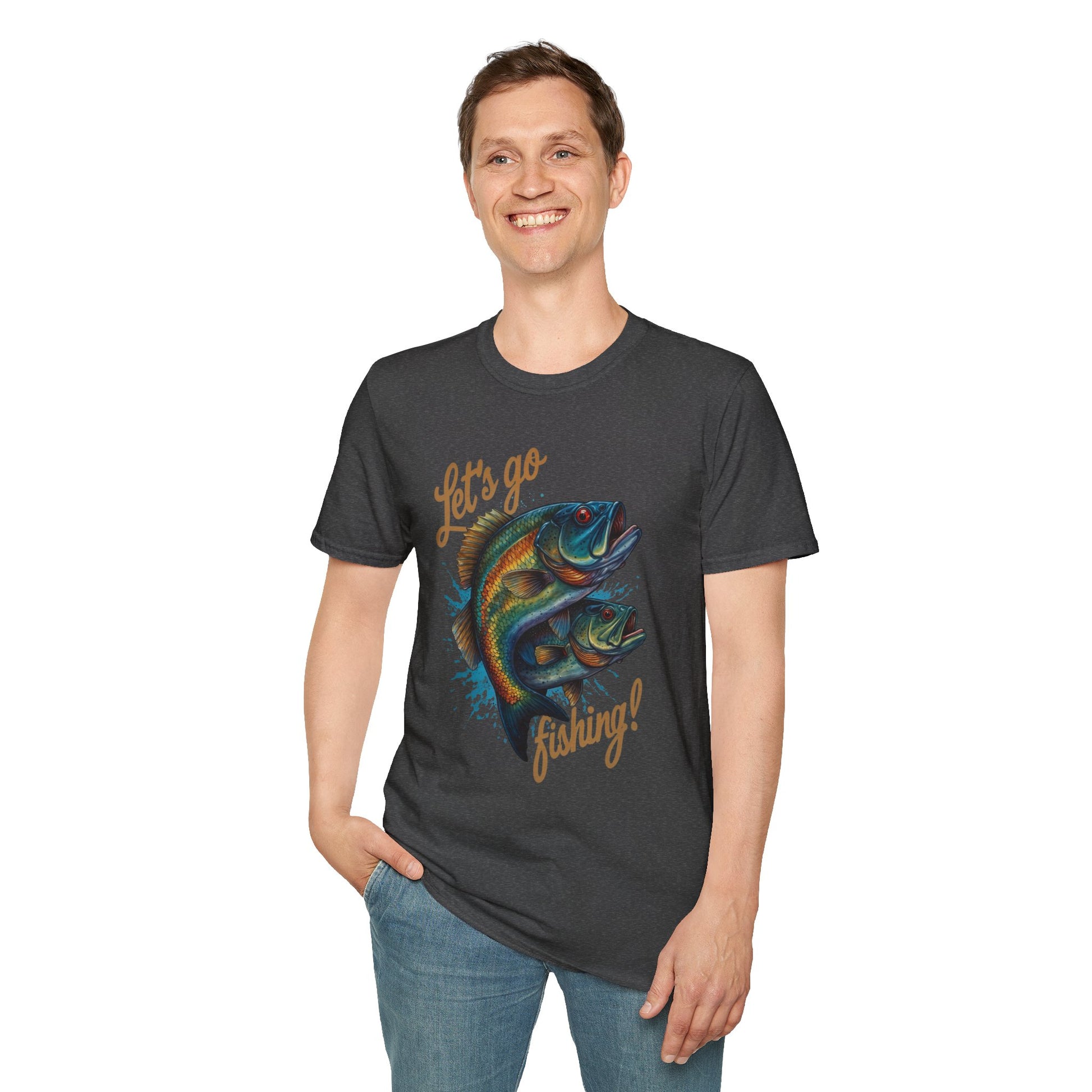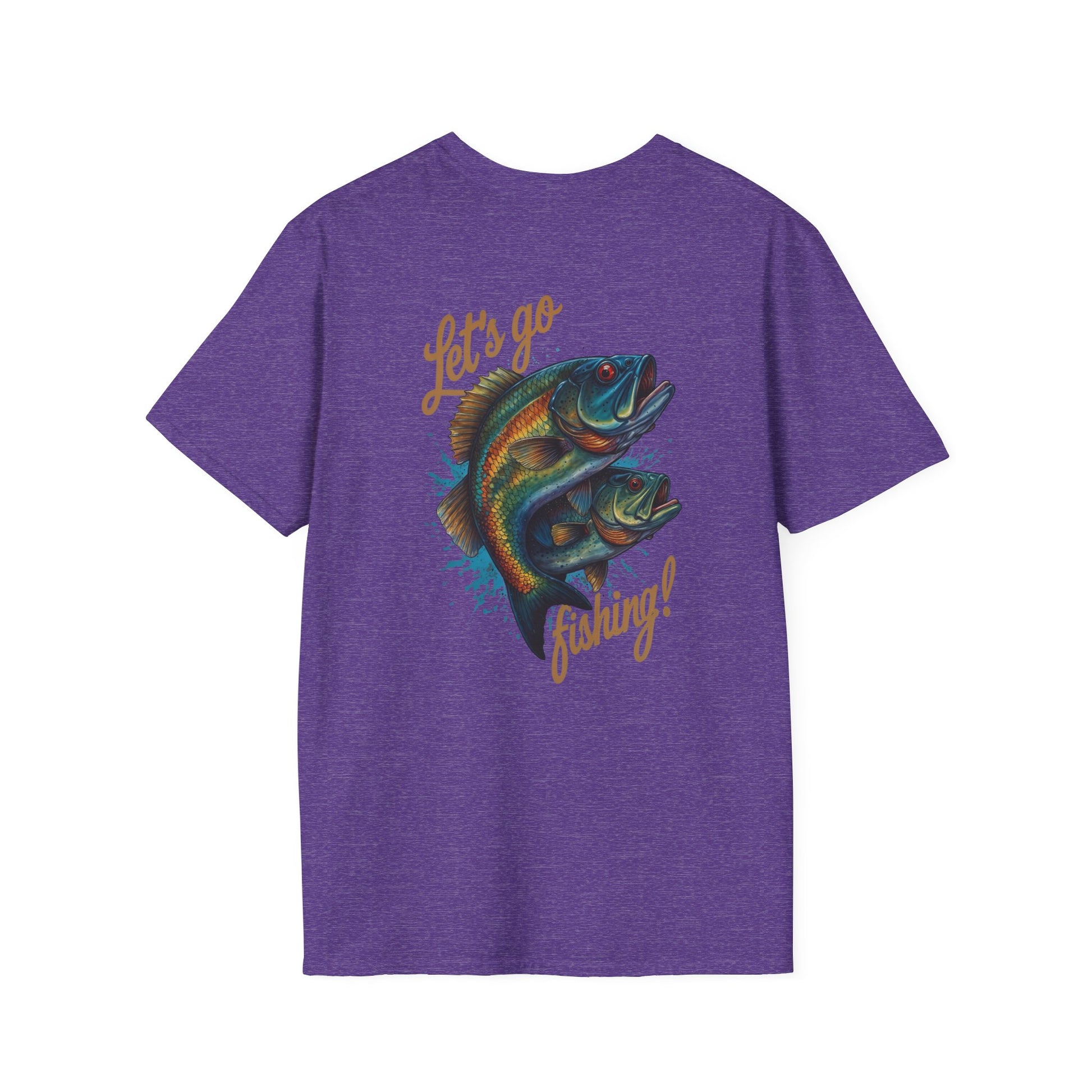 A fun and playful T-shirt featuring 2 bass jumping with the text 'let's go fishing'. Perfect for fishing enthusiasts and outdoor lovers, this T-shirt exudes a lively and adventurous vibe. Ideal for casual wear or as a statement piece during fishing trips and outdoor activities.