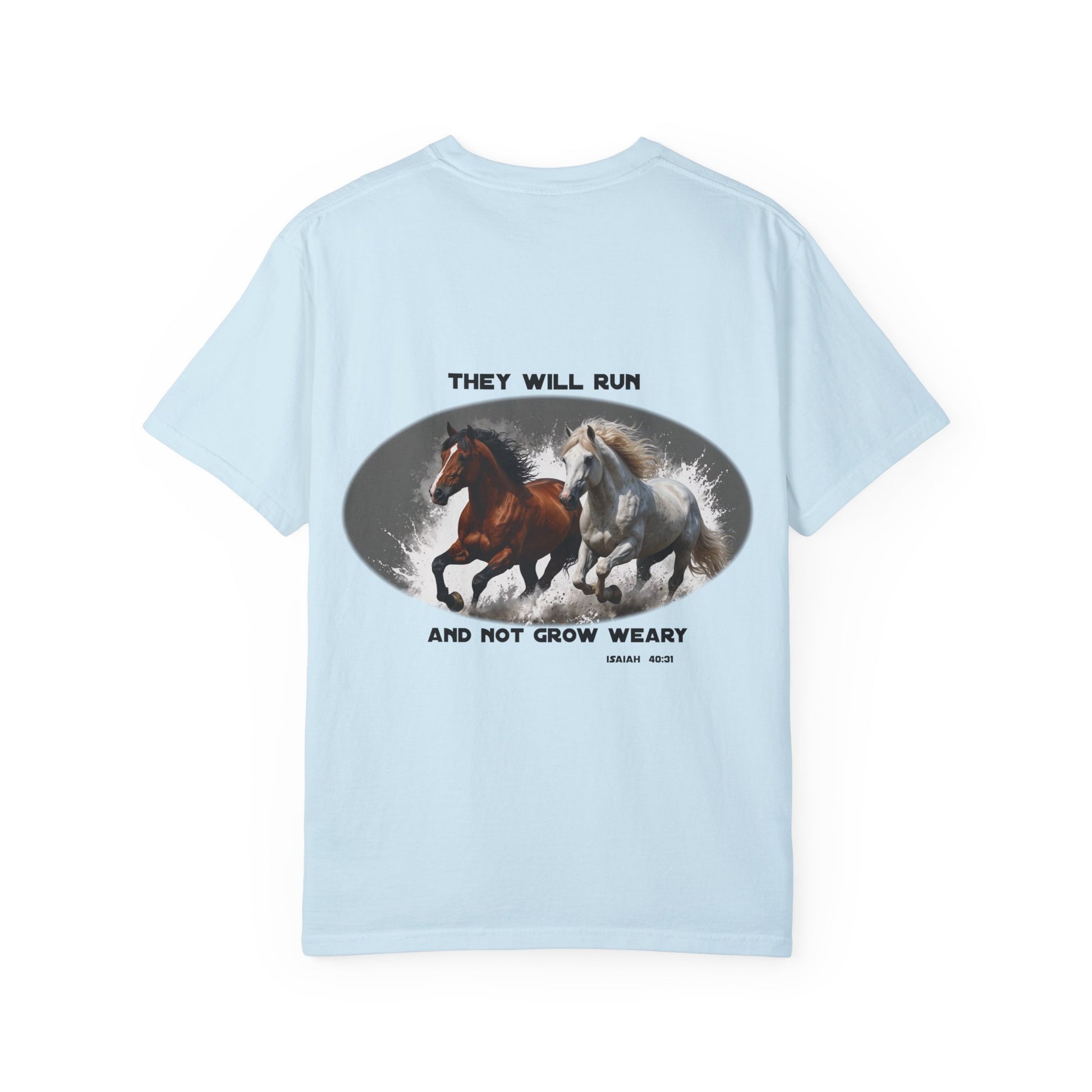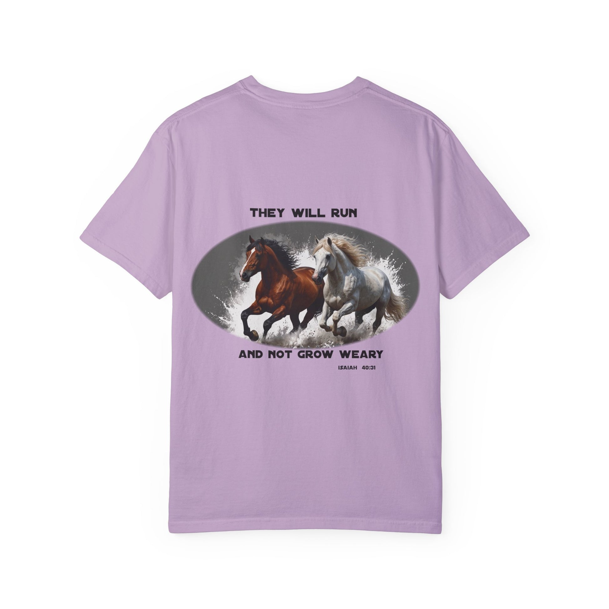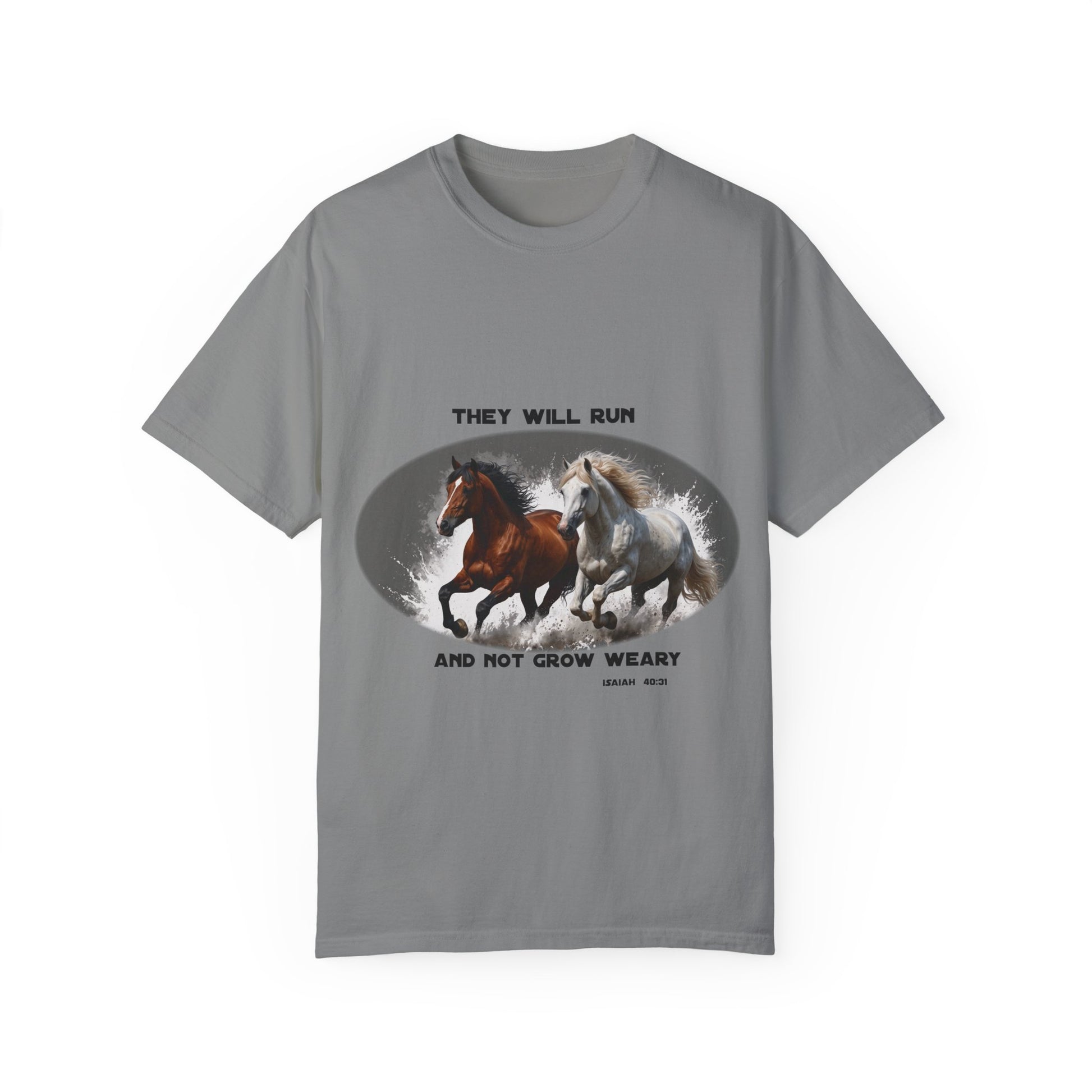 A comfortable, garment-dyed T-shirt featuring a design of horses running with the inspiring text "they will run and not grow weary." Perfect for casual wear or layering, this tee is made with high-quality US cotton for long-lasting comfort. Ideal for horse lovers, athletes, and anyone seeking inspiration. Great for gifting on birthdays, holidays, or as a motivational present.